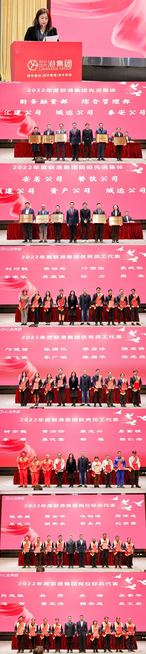 隨后,集團(tuán)監(jiān)事會主席邱影同志宣讀了聯(lián)港集團(tuán)2022年度先進(jìn)集體、防疫先進(jìn)集體、優(yōu)秀員工及崗位標(biāo)兵的表彰決定,區(qū)財(cái)政局邱局及集團(tuán)領(lǐng)導(dǎo)班子為獲獎單位及優(yōu)秀代表頒發(fā)了牌匾及證書,先進(jìn)集體、防疫先進(jìn)集體和崗位標(biāo)兵代表分別上臺作了發(fā)言。