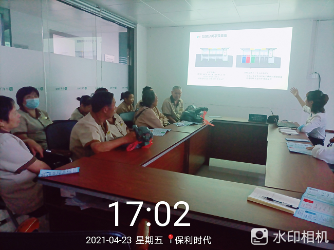 4月23日、24日下午聯(lián)港公司垃圾分類項目宣講員到保利時代、中海左岸嵐庭小區(qū)開展垃圾分類專題培訓(xùn),保利時代、中海左岸嵐庭物業(yè)管理層和保潔隊伍等共計50人,分成兩批參訓(xùn)。聯(lián)港公司垃圾分類項目宣講員受邀前往現(xiàn)場作《垃圾分一分金灣美十分》主題培訓(xùn)。