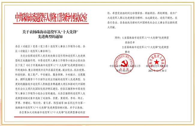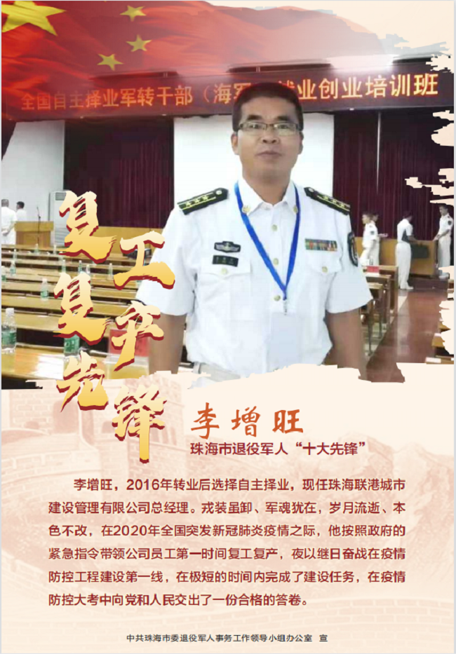 2022年4月26日,接珠海市委退役軍人事務(wù)工作領(lǐng)導(dǎo)小組辦公室通知,珠海聯(lián)港城市建設(shè)管理有限公司總經(jīng)理李增旺獲評“珠海市退役軍人十大先鋒—復(fù)工復(fù)產(chǎn)先鋒”。